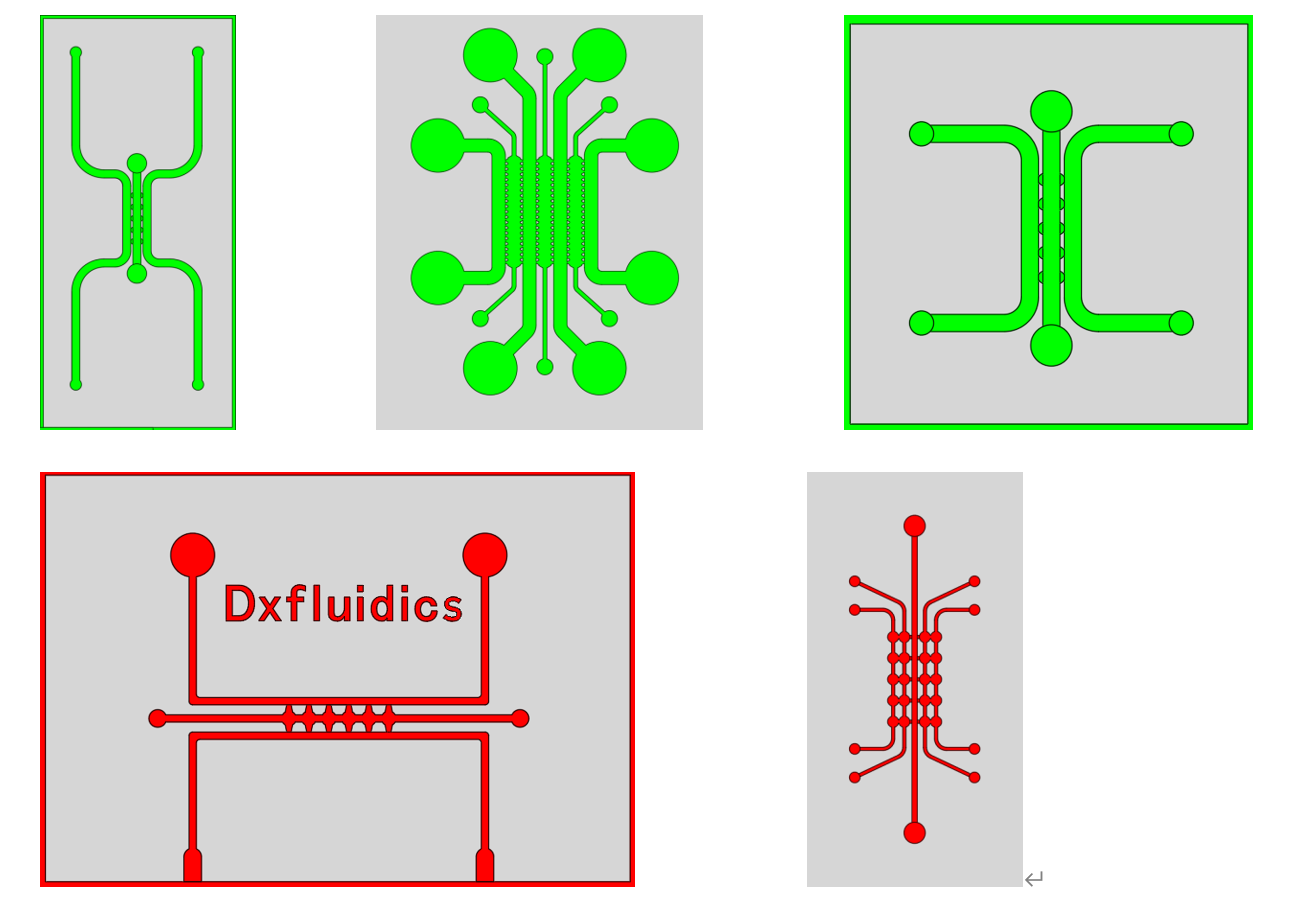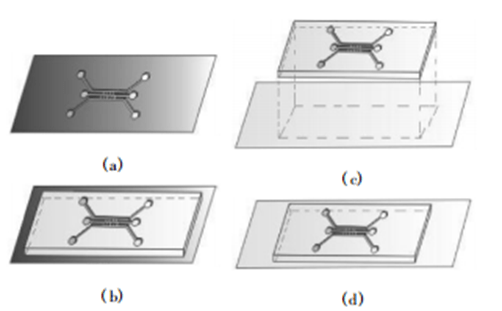 将切割下来 的 PDMS 片和载玻片同时放入等离子清洗器中,其中PDMS片带通道图样的面朝上,在25 W 微波功率 和 26 Pa 氧压下,处理 20 s 后,立即将PDMS片和载玻片取出并将待键合面贴合在一起,轻度挤压,去除贴合面间的气泡,使两键合面紧密贴合,并分别在通道各出入口处打孔,制成微流控芯片( 见下图 ) ,灭菌后备用。
