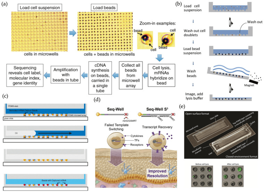代表性技术如Cytoseq、Microwell-seq和Seq-Well等,通过灵活的封闭策略(如机械密封、油封闭或半透膜)有效降低交叉污染,同时结合固相捕获、磁珠条码化和简化文库构建流程,推动了其在免疫学、神经科学等领域的应用。