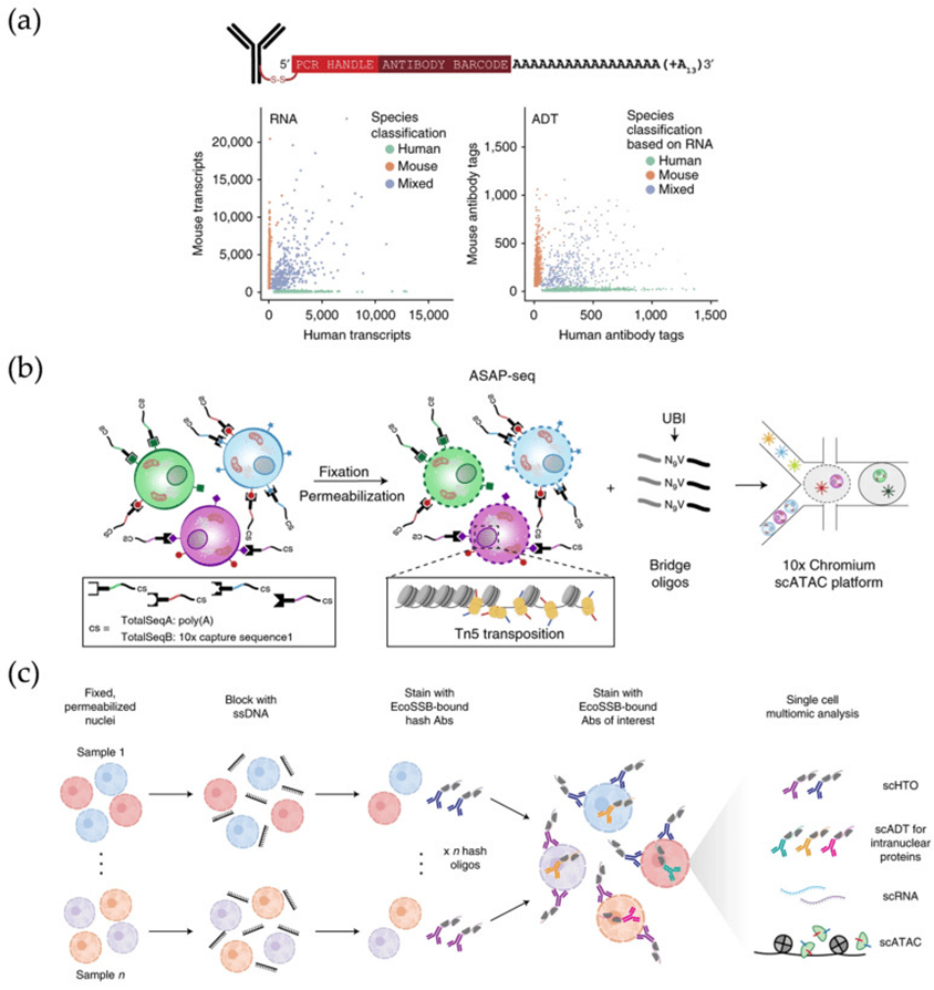 如CITE-seq和REAP-seq可同时读取转录本与蛋白表达信息,适配体替代抗体进一步降低了成本;ASAP-seq与NEAT-seq则实现了对染色质可及性、转录本和蛋白的三重检测。