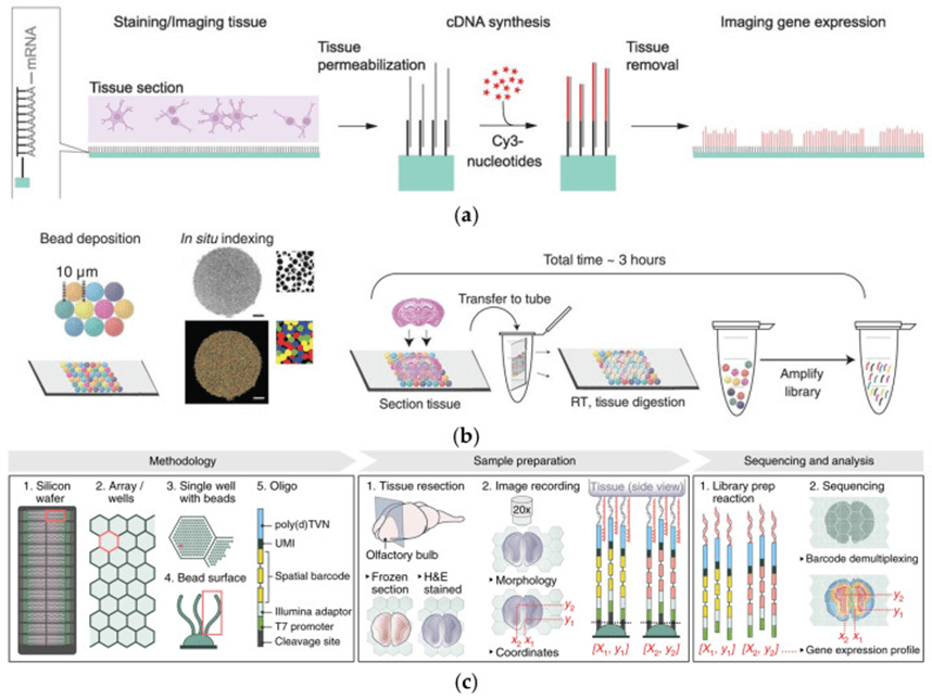 基于阵列的空间转录组学技术通过表面或微珠捕获polyA RNA,在保留空间信息的同时实现转录组测序,广泛应用于组织异质性研究。