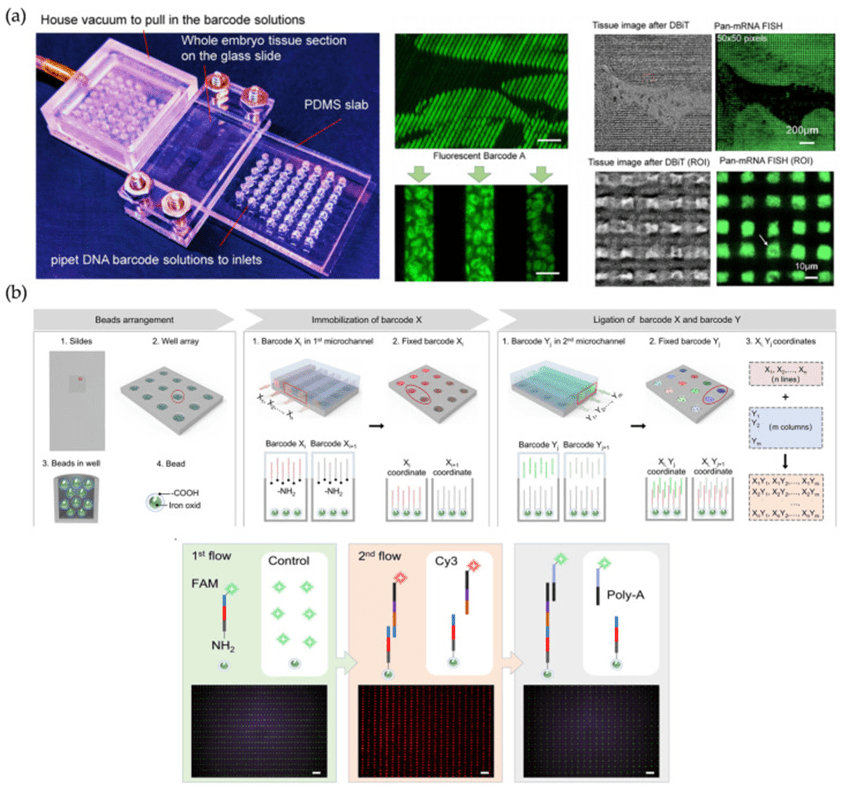 代表性技术DBiT-seq通过两块垂直交叉的PDMS微流控芯片在组织切片上构建空间像素网格,像素分辨率可达10微米,支持蛋白质组、转录组等多组学数据在同一组织上的高分辨率共解析,且兼容FF和FFPE组织切片。