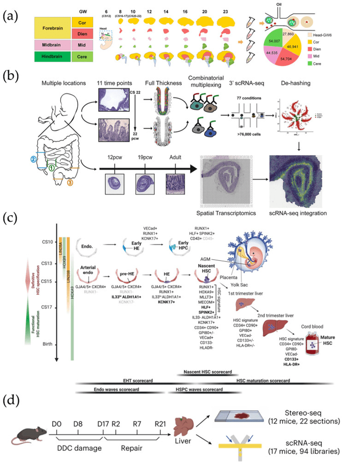 结合单细胞测序(SCS)与空间转录组(SRT),研究人员还揭示了肠道、四肢及造血干细胞(HSC)等关键系统的时空调控路径,并通过Visium等平台精确定义HSC的起源与调控因子。