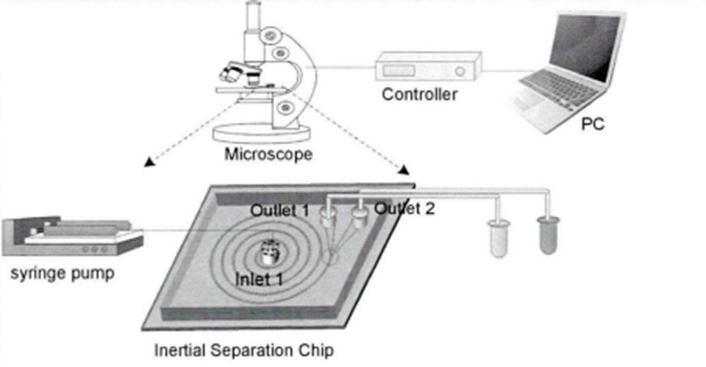 惯性分选系统主要包含高速惯性分选芯片、样品驱动模块、显微镜观测模块以及计算机图像采集和处理模块这几部分。