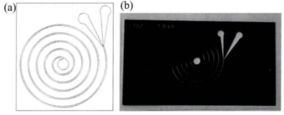 (a)螺旋结构分选芯片设计图(b)掩模实物图