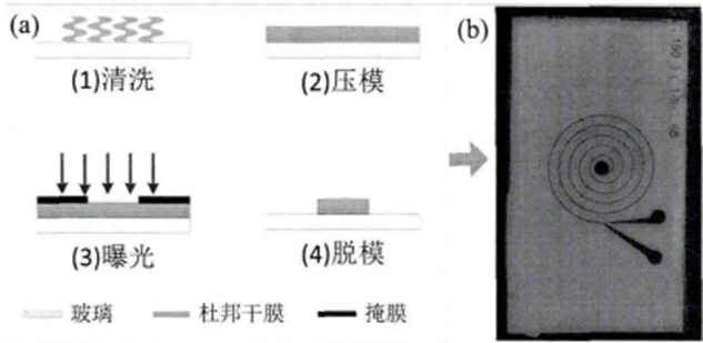 该方法相对于软光刻技术来说简单方便,但对于通道宽度较小的情况不适用,而且千膜的厚度固定(本章使用的厚度为38μm),更改通道的高度较为困难。浓度梯度芯片基底的制作过程如图2.3(a)所示,主要有四个步骤: