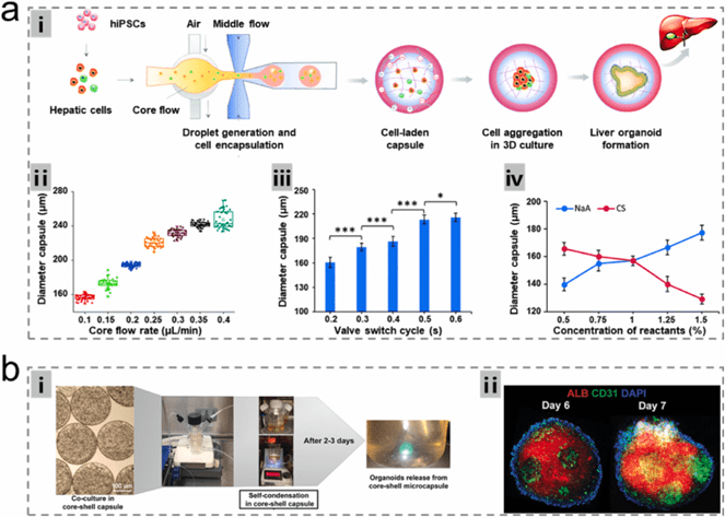 液滴微流控技术通过调控流体参数可高效制备尺寸均一的水凝胶微胶囊,为肝类器官培养提供理想3D平台。
