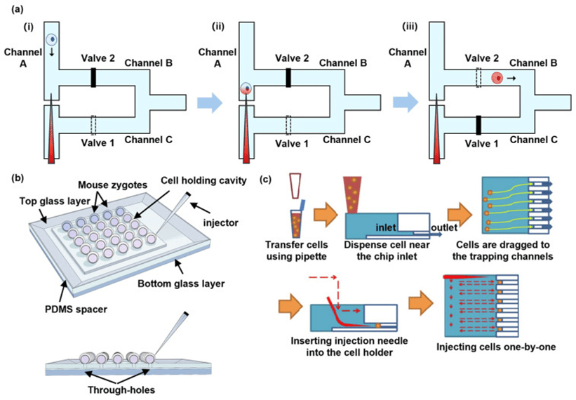 Adamo 和 Jensen 开发了微针固定化的微流控显微注射装置,实现单细胞自动转染;Liu 和 Sun 提出基于真空的固定化系统,提升至每分钟9个小鼠受精卵的注射效率,且细胞可顺利发育至囊胚阶段。