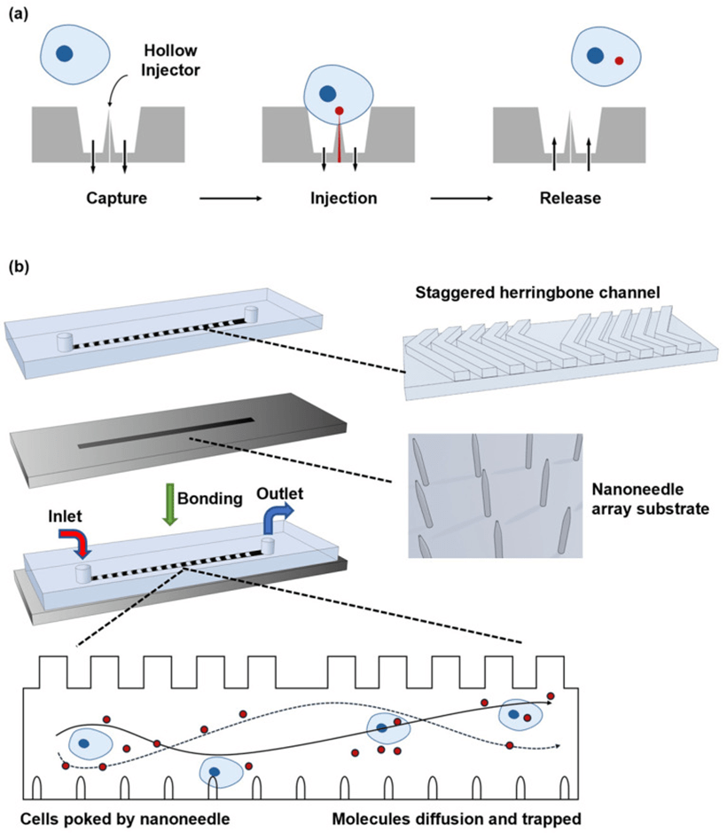 Huang 等人设计的微流控纳米针装置结合硅纳米针阵列与人字形通道,通过纳米针与细胞接触形成孔隙,使外源物质扩散进入细胞,实验中在人胚肾细胞中获得超过20%的GFP质粒转染效率和95%以上的细胞活力。