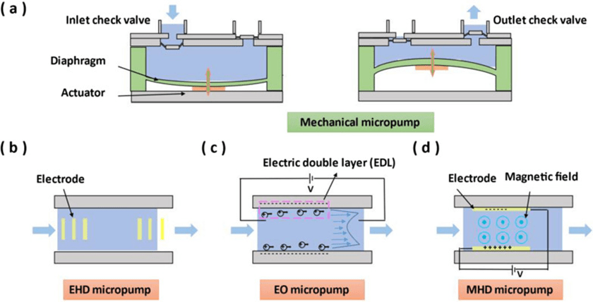 根据基本原理,微泵可分为机械微泵和非机械微泵。机械微泵具有用于泵送液体的运动部件,而非机械微泵则没有。