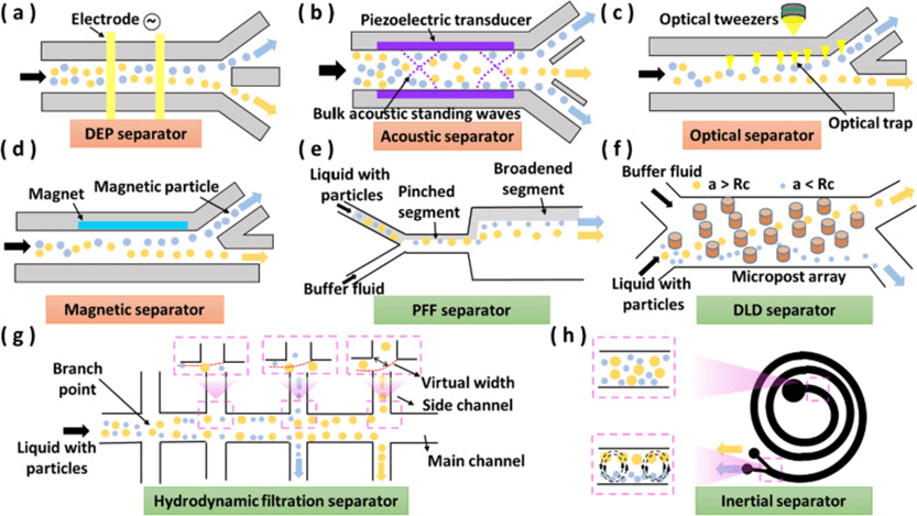 主动分离器利用外部物理场来分离颗粒,而被动分离器依靠颗粒之间的相互作用、微通道的几何形状和流场来实现分离。