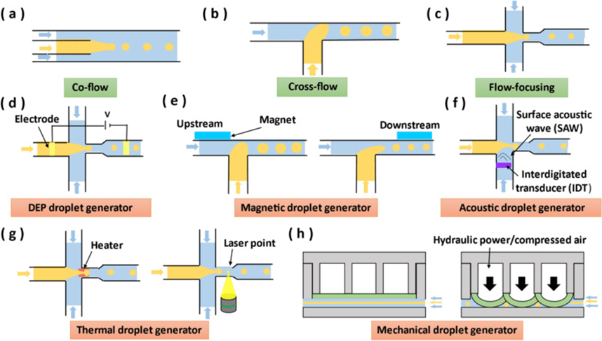 微流控中的液滴是指由一种液体(分散相)被第二种不混溶液体(连续相)包围而形成的悬浮且可变形的乳液微液滴。