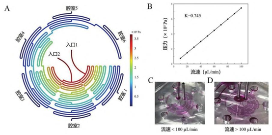 环形弯曲流道:改进自 “圣诞树” 模型,流道宽 200μm、高 100μm,通过螺旋路径增强层流混合效率,缩短药物扩散距离,实现 6 种梯度浓度在腔室均匀分布。